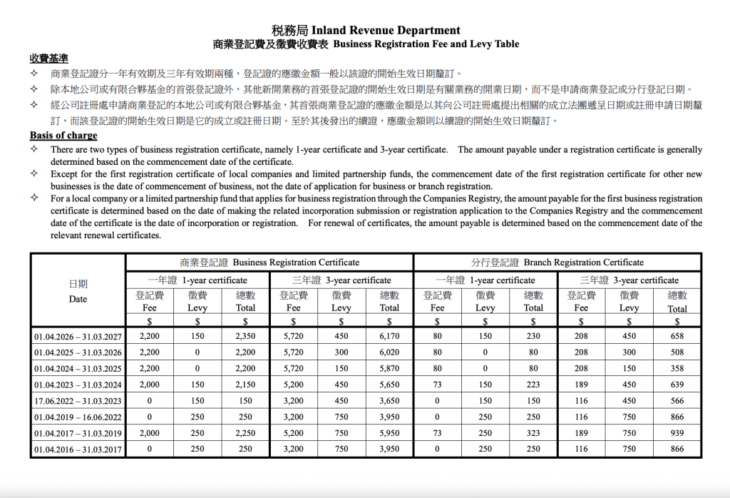 稅務局已公布最新之收費表,由2026年4月1日起,商業登記費之徵費不再豁免。